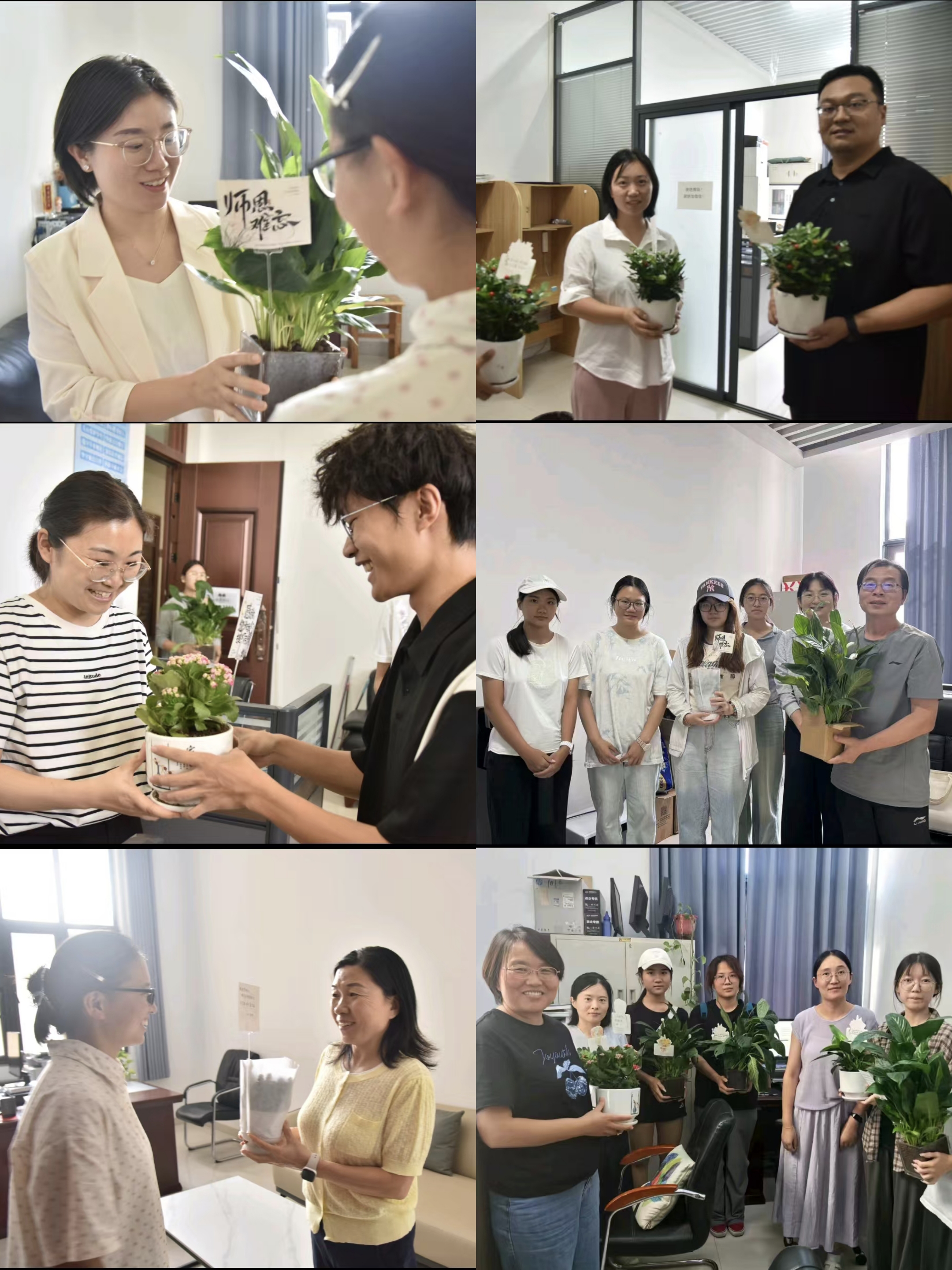 接着,学院各系工会组长带领学生“送绿小分队”前往各系老师办公室开展教师节献花活动。学生们亲手将绿植和贺卡送至老师手中,并与老师亲切交流。每一盆绿植象征着生命的蓬勃与希望,寓意教师们的教诲如春风细雨,滋养我院学子成长;每一张贺卡则满载学生的真挚感恩与祝福,笔墨之间无不表现对老师无私奉献的深深敬意。