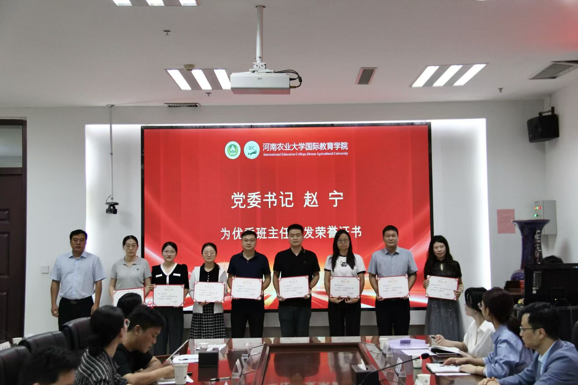 本网讯(通讯员 张義飒 图片 张義飒)为弘扬尊师重教风尚,表彰育人先进典型,凝聚学院教师队伍奋进力量,在第41个教师节来临之际,国际教育学院于9月9日上午在龙子湖校区A215教室召开2024至2025学年优秀班主任表彰会暨2025级新生班主任工作会议。院党委副书记赵玮莉主持会议,院党委书记赵宁、副院长邢林鸿、优秀班主任及新生班主任参会,共同迎接节日、总结经验、部署新篇。
